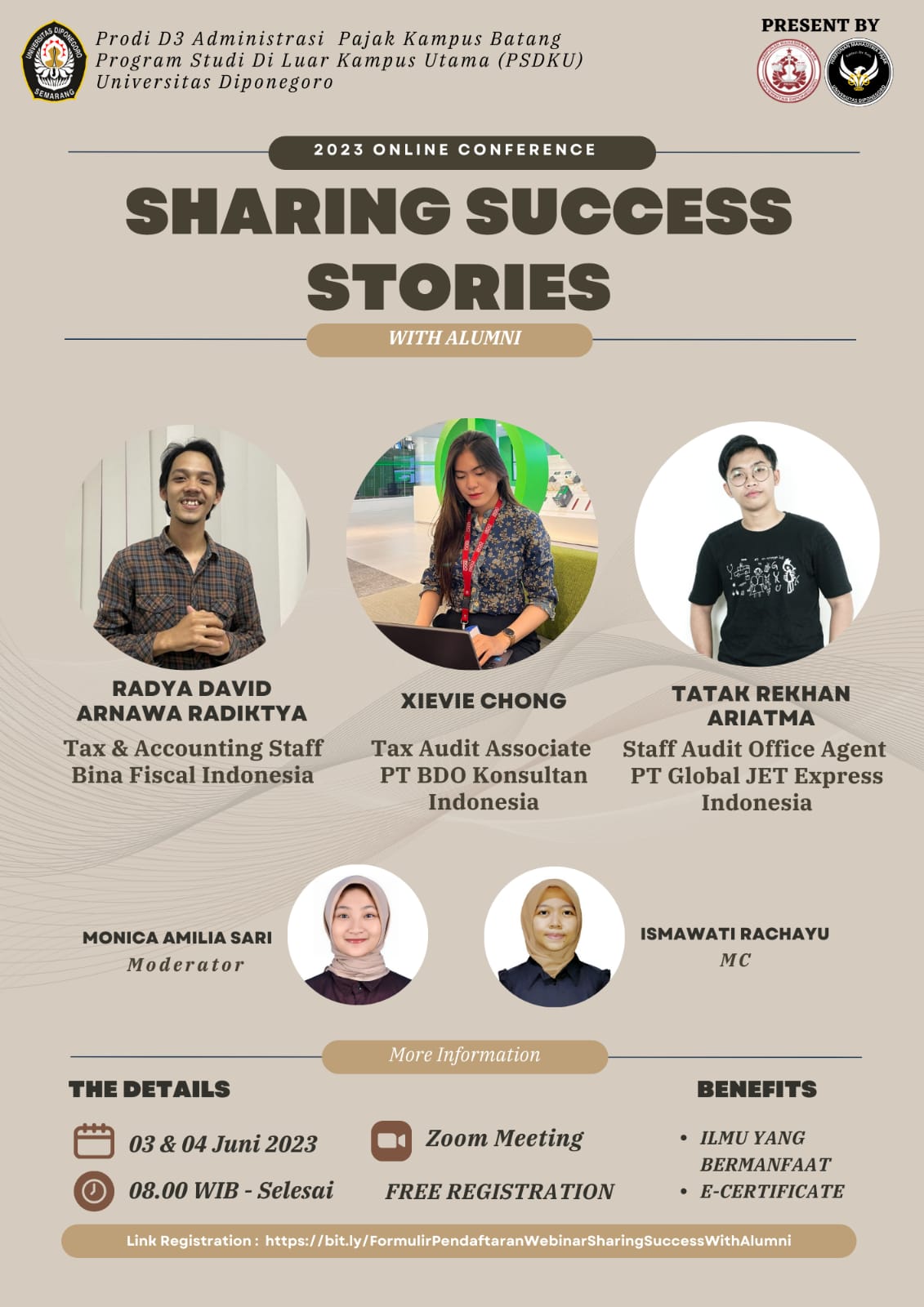 In order to increase alumni contributions to their alma mater, alumni need to be involved in campus activities such as sharing work experiences to increase students' knowledge about the world of work. To make this happen, the D3 Tax Administration Study Program Student Association, PSDKU Batang Campus, Diponegoro University held an event “Webinar Sharing Success Stories with Alumni which was held over 2 sessions, namely on Saturday, 3 June 2023 and Sunday, 4 June 2023.  The event was enjoyable because the webinar brought together speakers from Alumni and D3 Tax Administration Students Class of 2020 who are outstanding and have successful careers.