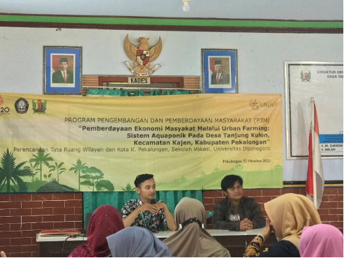 Pekalongan, 22 October 2022 – Community Development and Empowerment Program Activities (P3M) “Community Economic Empowerment Activities Through Urban Farming: Aquaponic System Tanjung Kulon Village, Kajen District, Pekalongan Regency” was held on Friday, October 22, 2022 from 08.30-12.00 WIB offline at the Tanjung Kulon Village Hall, Kajen District, Pekalongan Regency. The Community Development and Empowerment Program was attended by the Community Service Team, namely Brian Pradana MT, Retno Susanti MT, and Nofa Martina Ariani MT, Tanjung Kulon Village Officials, D3 Student Association of Regional and City Spatial Planning Pekalongan Campus (HMPSDPWK) and 35 trainees . The event began with the provision of materials related to Aquaponic Basic Training (Manufacturing, Maintenance, and Development).
